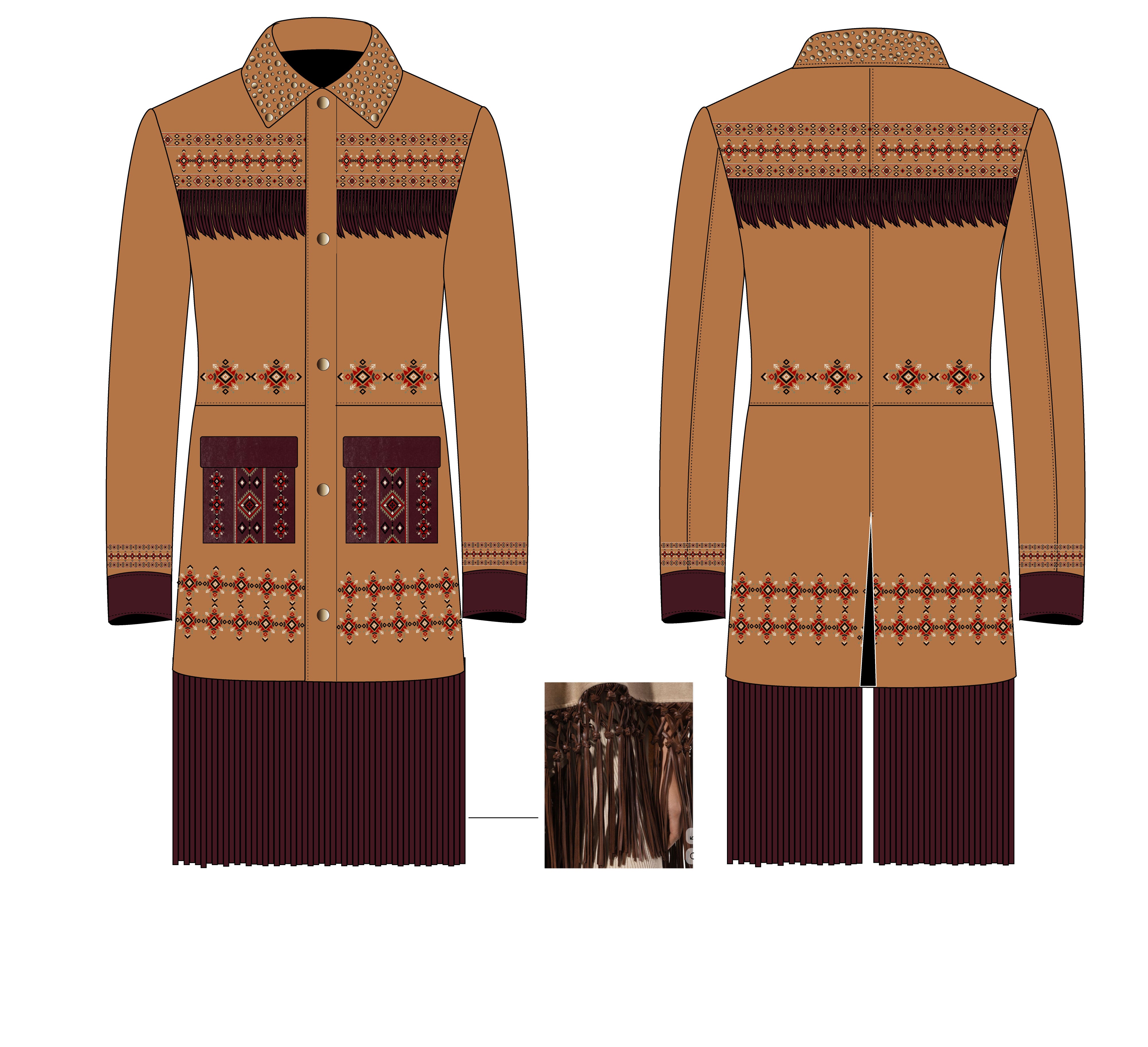 • Technique: Embroidery, fringes, leather macrame (as per reference image)